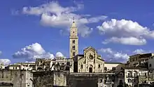 Matera Cathedral (Italian: Duomo di Matera; Cattedrale di Santa Maria della Bruna e di Sant'Eustachio) is a Roman Catholic cathedral in Matera, Basilicata, Italy. It is dedicated to the Virgin Mary under the designation of the Madonna della Bruna and to Saint Eustace. Formerly the seat of the Bishops, later Archbishops, of Matera, it is now the cathedral of the Archdiocese of Matera-Irsina.