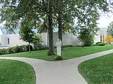 The campus features a 5-foot (1.5 m) solid marble statue of St. Joseph and the Christ Child. It faces east toward the Carmelite monastery and the chancery and is located on the east lawn. It was added to the campus in 2005 from a closed parish in St. Louis. Also on the east lawn, there is a pin oak, known as the Pentecost Tree, which was planted by Bishop Gaydos in 1999. Soil used to plant the tree was brought to the campus from each of the parishes of the diocese. At the Bishop's entrance to the cathedral, is a modern, concrete sculpture of St. Francis and the animals. It is a two-sided sculpture that is the work Siegfried Reinhardt of St. Louis. It was donated to the cathedral in 2009 by a parishioner. There is a cornerstone also near the Bishop's entrance. A limestone engraved sign adorns the front lawn. It was installed in 1985. There is a grotto of Our Lady of Fatima, which includes the figures of the Blessed Mother, the three seers, and animals. It is located on the south lawn and was donated by the closed LaSalette Seminary. Each of the figures is made of concrete and was restored in 2009.