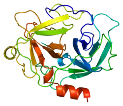- ↑ Salvesen G, Enghild JJ (1991). "Zymogen activation specificity and genomic structures of human neutrophil elastase and cathepsin G reveal a new branch of the chymotrypsinogen superfamily of serine proteinases". Biomedica Biochimica Acta. 50 (4–6): 665–71. PMID 1801740.