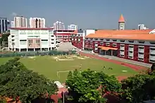 The Catholic High School was classified under the Special Assistance Plan in 1979.[1] This enables it to offer students in the top 10% of the cohort both English and Chinese as their first languages. In the same year, pre-primary classes were started to prepare students for primary school Chinese study. With continued increase in enrolment, the Queen Street buildings could not house all the students from all levels, even with double-sessions arrangements. Satellite sites augmented the Queen Street school grounds. Pre-primary and lower-primary classes were housed at Gentle Road and upper-primary classes were housed at Norfolk Road. In March 1987, discovery of structural cracks at the Queen Street premises of the primary section caused the campus to be declared unsafe.[10] Despite clarification later as a misjudgment, the incident prompted a decision by the Ministry of Education to relocate Catholic High School, for safety concerns in wake of the Hotel New World collapse.[9] The high school section was relocated to the premises of Guangyang Secondary School in Bishan. Both the primary and secondary sections of the school moved to its current, permanent campus at Bishan Street 22 in 1992. In 2008, Catholic High School was awarded the School Distinction Award under the MOE Master Plan of Awards, in recognition of its value-added holistic development of its students through exemplary processes and practices.[11]