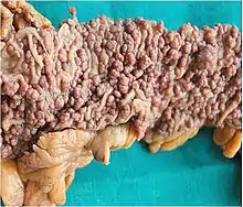 Multiple colon polyps within the colon of an individual with familial adenomatous polyposis