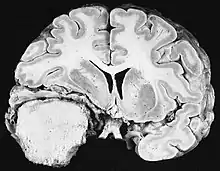 Cross section of a meningioma displacing the underlying brain.