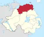The district covers most of the northern part of Northern Ireland; an area totalling 1796 km2 spanning parts of Counties Antrim and Londonderry. It has a population of around 141,664.[1] The name of the new district was announced on 17 September 2008 as 'Causeway Coast' and was revised in February 2009.