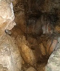 The top levels excavated contained Neolithic materials, such as ceramic items, together with human bones consistent with the existence of a necropolis and the bones of small animals. The relatively few tools found suggest that the cave never served as a permanent dwelling for humans. Lower levels contained evidence of Solutrean lithic and bone tools and artefacts of the Upper Paleolithic, together with bones of various fauna. There is evidence that some of the Paleolithic levels were removed in part of the cave during the Neolithic to make way for the necropolis. Animal bones discovered included those of brown bears (Ursus arctos) and cave bears (Ursus spelaeus); leopards (Felis pardus) and Iberian lynx (Felis pardina); hyenas; wolves; and horses.[2][4]