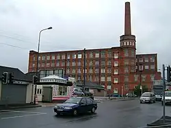 The Cavendish Spinning Company Limited was registered in 1884 to build the Cavendish Mill on the site of the former Bankfield Mill. This was a Potts building. It was six storeys high on the canal side, and five on the other. It is a fireproof design and was the first mill in Ashton to have concrete floors and a flat roof.[1] It is instantly recognisable by the octagonal staircase that surrounds the lower part of the chimney.[3] It stopped spinning in 1934 and was put to other uses. It still stands.