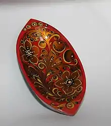 The caviar bowl is a piece of tableware used for serving caviar.[1] Caviar is a highly perishable food and is therefore frequently served on ice,[2] especially if offered before dinner or in a buffet arrangement.[3] The typical caviar bowl is therefore made of two parts, with the outer one, to be used for ice, made of fine materials (silver plate, nickel-plated brass) in a fancy and decorative shape. The outer bowl can be used on its own for other dishes.[1] Occasionally, the outer bowl is made of wood.[4]
