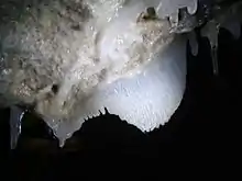 It then goes to the second room that looks much like the previous one with the presence of concretions and basins . This last room is closed on a crack up to two metres above the ground. There is a colony of bats. The second room is over 200 meters long and 75 metres wide and has a vault located about forty metres above the ground in places.