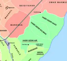 Ayr (Somali: Cayr or Ceyr), Muhammad Madarkicis Hiraab is a Somali clan, part of the larger Habar Gidir Hawiye clan. The Ayr clan is the eldest Habargidir sub-clan and is the largest Habargidir sub-clan numerically.[1] The Ayr clan have a rich history in Somali society and has played a fore role in shaping Somali history and national politics. They reside in 6 out of the total 18 regions of Somalia but are primarily found in the central region of Somalia, Galgaduud which they hold a monopoly over and is considered their heartlands. They are the most powerful sub-clan in central and southern Somalia controlling important sections of the country and have a great influence over the nation's capital Mogadishu.[2]