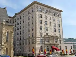 Cecil Apartments is a historic apartment building in Baltimore, Maryland, United States. It is a seven-story building constructed of multiple shades of light-colored brick, accented with limestone and cast terra cotta ornament in the Beaux-Arts style. The structure takes the form of a "T". Constructed in 1902, it was one of the first important apartment buildings in Baltimore, built at the edge of the city's most elite downtown neighborhood, Bolton Hill. It was designed by Baltimore architect Edward Hughes Glidden, and it marked the evolution of elite living that had come to characterize the Bolton Hill neighborhood.[2] Despite the apartments' location often being referred to as Bolton Hill, it is actually within the boundaries of the adjacent Madison Park neighborhood.[3]