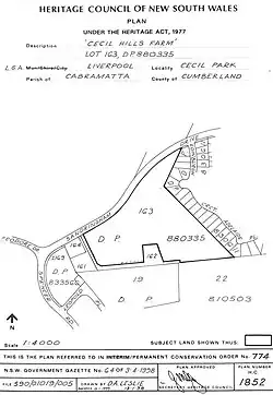 - 1 2 3 4 5 6 7 8 9 10 11 12 13 14 15 16 17 18 19 20 21 22 23 24 25 26 "Cecil Hills Farm". New South Wales State Heritage Register. Department of Planning & Environment. H00774. Retrieved 2 June 2018.