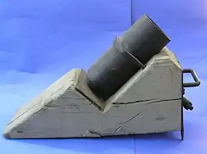 Faced with heavy and effective German mortar fire in the Argonne sector French Artillery Captain Cellerier developed an improvised light trench mortar in November of 1914 that utilized cheap and available materials. The base of the mortar was made from a wooden beam with a +45° notch cut out of it and the smoothbore barrel was made from discarded shell casings from the German 7.7 cm FK 96 n.A. field gun. The shell casing was modified by drilling a hole in the base for a pyrotechnic time fuze and the barrel was fastened to the base with a metal bracket which extended through the base and was bolted to the front. Photos of surviving mortars look like an iron pipe could also be used for the barrel instead of shell casings. An iron plate with a handle was attached to the front of the base to carry the mortar and two small spikes at the bottom of the plate anchored the base.[1]