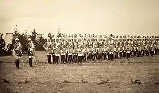 During the Franco-Prussian War of 1870 part of the squadron accompanied the Emperor to Metz, and during the Battle of Sedan they were constantly at his side.[3] The squadron was disbanded by a decree of 1 October 1870 and the serving Cent-gardes were transferred to the Second Regiment of Cuirassiers, which served dismounted in the defense of Paris following the dissolution of the Second Empire.[3] The black horses of the Cent-gardes were amongst the animals butchered to feed the starving population during the Siege of Paris.[9]