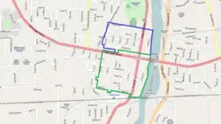 ![]() Location of the Central Geneva Historic District (green outline) within Geneva. The adjacent North Geneva Historic District is outlined in blue to the north. | |