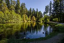 The 5-kilometre (3.1 mi) Terry Fox Trail circles around the upper pond and just reaches the lower pond. Visitors often use this trail for physical activity purposes and it is annually used for the Terry Fox Run for the City of Burnaby.[5] The 2.6-kilometre (1.6 mi) Trail of Hope also circles around the upper pond and reaches the lower pond while a 1.9 kilometer trail circles a portion of the parkland.[6]