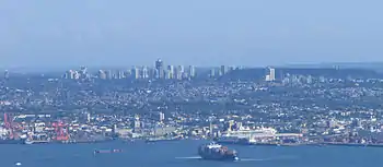 Metrotown (L) and Central Park (R) from Vancouver's North Shore. Port of Vancouver in foreground.