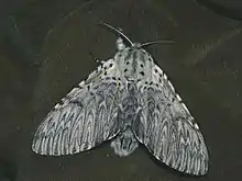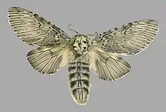 Cerura vinula has a wingspan of 58 millimetres (2.3 in) to 75 millimetres (3.0 in) – the males are slightly smaller.[2] The head, thorax, and body of these moths are very fluffy, with a cat-like appearance (hence the common English name puss moth).[2] The antennæ are bipectinated. They have white or yellowish-gray forewings crossed by several wave-like dark lines. The hindwings are light gray or whitish in the males, while in the females they are suffused with blackish but almost transparent. The body is whitish gray, with the dorsal abdomen banded in black.[3]