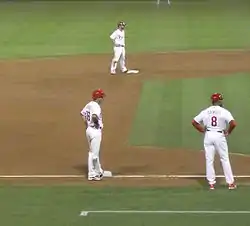 In 2018, he fouled a pitch off his right foot in early July, breaking it, but played with a broken foot for much of the second half of the season as his injury wasn't serious enough to require surgery.[31][32][33] Hernández played all but one game during the season.[34] In 2018, Hernández batted .253/.356/.362 with a career-high 95 walks (5th in the NL), 91 runs, 15 home runs, 60 RBIs, and 19 stolen bases.[23] He led the majors in total pitches faced (3,009), and walks when leading off an inning (33), tied for the major league lead in bunt hits (8), was 2nd in the National League in plate appearances (708), 3rd in infield hits (26), 4th in pitches/plate appearance (4.25), 6th in games played (161), and 9th in strikeouts (155) and times on base (252).[23][35][36] He had the fastest baserunning sprint speed of all major league second basemen, at 29.2 feet/second.[37] On defense, he led all NL second basemen in errors, with 12.[23] His broken foot later healed.[33]