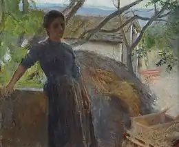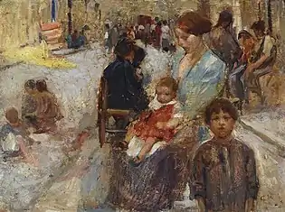 By the turn of the century his works had taken on a more urban quality, reminiscent of Lovis Corinth, with a focus on workers. His landscapes also became brighter and his brushstrokes more fluid. In 1922, he participated in the "Primaverile Fiorentina" (Florentine Spring), presenting a series of paintings on rural and popular subjects, many of which depicted the old and crowded Florentine district of Borgo San Frediano; done in a Post-Macchiaioli style.