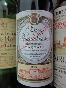 Château Rauzan-Gassies is a winery in the Margaux appellation of the Bordeaux region of France. Château Rauzan-Gassies is also the name of the red wine produced by this property. The wine produced here was classified as one of fifteen Deuxièmes Crus (Second Growths) in the original Bordeaux Wine Official Classification of 1855.