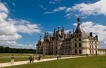 One of the architectural highlights is the spectacular open double-spiral staircase that is the centrepiece of the château.[1] The two spirals ascend the three floors without ever meeting, illuminated from above by a sort of light house at the highest point of the château. There are suggestions that Leonardo da Vinci may have designed the staircase, but this has not been confirmed.[1] Writer John Evelyn said of the staircase, "it is devised with four [sic] entries or ascents, which cross one another, so that though four persons meet, they never come in sight, but by small loopholes, till they land. It consists of 274 steps (as I remember), and is an extraordinary work, but of far greater expense than use or beauty."[9]