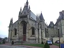 After belonging to the House of Amboise, then being annexed to the royal domain by Louis XI of France, the viscounty was given to the house of La Trémoille in 1489, that were made dukes later by Charles IX of France.[2] Gabrielle de Bourbon, wife of Louis II de La Trémoille ordered the construction of the chapel built between 1503 and 1509 which is still visible today. The chapel is of flamboyant gothic style for the lower part and influenced by Italian Renaissance for the upper gallery and was designed by several architects including André Amy and Jean Chahureau. It was designated as a collegiate church in 1515 by Pope Leo X and hosted a relic of the crucifixion of Jesus Christ.[1]