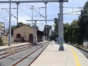 Chalcis railway station (Greek: Σιδηροδρομικός σταθμός Χαλκίδος, romanized: Sidirodromikos stathmos Chalkídos) is a railway station in the city of Chalcis, in Euboea, Greece. Opened on 8 March 1904, it is now the northern terminus station of the Athens - Chalcis service of Proastiakos.[3] The station sits close to the waterfront, with a small promenade running parallel to the platforms. It is owned by OSE, but services are provided by Hellenic Train through the Athens Suburban Railway to Oinoi and Athens.