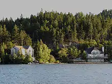 The lake is situated at 95 ft (29 m) above sea level, and has a maximum depth of 200 ft (61 m).[4] The Chamcook River which feeds the Chamcook Lake rises from the cone shaped hill range of Mt. Chamcook. The Chamkcook harbour, a wet dock, lies is to the eastern side of the peninsular where development took place.[7] It contains Odell Island in the southeast and Big Rock in the north. Despite its name, the Odell Island is larger than Big Rock. Approximately 2.2 mi (3.5 km)[8] to the north beyond Big Rock is a sister lake named Little Chamcook Lake. The Chamcook Lake watershed serves as a potable water supply for the Atlantic Salmon Federation, the St. Andrews Biological Station, the Champlain Industrial Park, and the town of St. Andrews.[9]