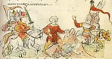 Grand Prince Vladimir (wielding a sword) beholds enemy forces withdraw as his champion Nikita the Tanner defeats the Pecheneg champion. Detail of a 15th-century medieval chronicle.