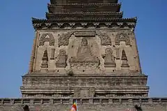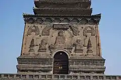 The eaves portion of the tower has 13 floors in total, the first to the eleventh floors having been transformed from the eaves of the fourth to the fourteenth floors of the Sui Tang Pagoda, and the twelfth and thirteenth floors having been both reconstructed in the Liao Dynasty. The first floor is an imitation wood, brick arch with a large eave which is 1.64 meters high and 1.96 meters out. From the second story onwards, the eaves of the tower are gradually divided. Above the eaves, part of the tower is the tower brake. The base of this pagoda is a brick octagonal rosette. The rosette is surmounted by a girdle and a green glass glazed rosette with an overlapping bowl above the rosette.[1][3]