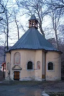 Chapel of the Holy well is a chapel located in Marianka, Slovakia. Rotunda Chapel of the Holy well was commissioned in 1696 for 1000 golden coins by earl Paul Eszterhazy and local baron Ján Macholány, who can be found pictured with his family on one of the ceiling frescos. In 1722, a renovated baroque altar was built, replacing the original one. In 1877, the statues of St. Anthony and St. Paul the Hermits were erected in front of the chapel. These statues came from the workshop of Rafael Donner, eventually being replaced by replicas created in Brno in 1981. Originals were transferred to the Slovak National Gallery, where they are a part of the original Baroque Art exhibition.[1] The chapel was constructed directly above the stream, out of which the water is directed to the front of the chapel directly accessible to the visitors. The stream beneath was reported to have miraculous healing effect on physically handicapped pilgrims visiting the site. In the book of Kummer from the record of the local cloister, 140 recoveries were reported between 1634 - 1730.