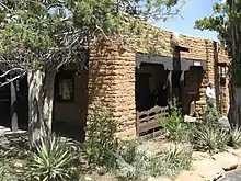 Dating to 1922–1925, the Pueblo Revival museum building, designed and constructed during the tenure of archeologist and park superintendent Jesse L. Nusbaum, is an early example of "parkitecture" an informal name for park buildings intentionally designed to be aesthetically appropriate to and reflective of the natural environment and strong cultural traditions of the various natural parks.[2][3] It is one of six park buildings created from local buff sandstone with projecting wood beams ("vigas").[4] The museum's construction was funded by donations from John D. Rockefeller Jr.[5]