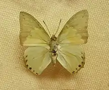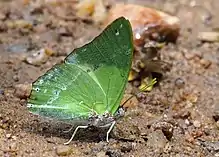 The green colouration is produced by pigments as opposed to being produced structurally, which is common in most green butterflies.