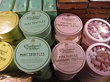 The company also produces a themed "James Bond – 007" range, inspired by the James Bond film franchise, including 007 Dry Martini Truffles.[7] Their hot drinking chocolate was created by Madame Charbonnel in 1875; it is available in Original and Sea Salt Caramel flavours.[8]