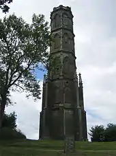 Charborough Tower is a Grade II* listed octagonal folly tower dating from 1790, extended in 1839 into a five-storey building. It is situated on a hill southeast of the house (50°46′39″N 2°06′06″W / 50.77753°N 2.10178°W),[6] with the vista of a triumphal way running between them.[7]