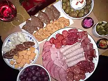 ![]() A charcuterie board with various cured meats, cheeses, and fruits | |