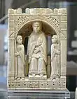 The "housing", which is elaborated with architectural details and emphasizes the king and queen, is peculiar. The carvings each show a semicircular pavilion with arcades on the back and a straight front in the shape of a ciborium. In the scene, servants pull up a curtain from both sides, which previously shielded the appearance of the king or queen and the room behind. It is the revelation of the monarch, the climax of the Byzantine court ceremony.