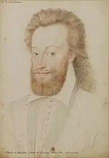 Charles fought for Henry at the battle of Coutras in 1587,[4] was then introduced and secretly engaged to Henry's sister Catherine.[3] He attended the Estates General at Blois in 1588, fought back the League's forces at the battle of Saint Symphorien in 1589, was taken prisoner at Château-Giron and, escaping from Nantes, joined forces with Henry at Dieppe. After the battle of Ivry he led the king's cavalry in besieging Paris in 1590, and proved his worth at the sieges of Chartres in 1591 and of Rouen in 1592. Although he briefly joined in the scheme of his brother Charles, Cardinal de Bourbon, to form a third party in the kingdom, he attended Henry's coronation in 1594. He fought loyally at the successful siege of Laon. Peace having been concluded with Spain, he commanded troops in the war in Savoy in 1600.[5]