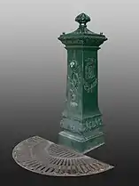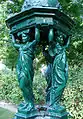 The larger fountains stand 2.71 metres (8.9 ft), and consist of an octagonal pedestal topped with four unique caryatids– representing kindness, simplicity, charity and sobriety– supporting a dome decorated with dolphins.[1][10] The design of this larger model was inspired by the Fontaine des Innocents in Paris,[10] while the caryatid figures may have been inspired by Renaissance sculptor Germain Pilon's Les trois grâces.[1] Some smaller models feature the head of a nymph to distribute water, and later models utilize columns rather than caryatids.[10]