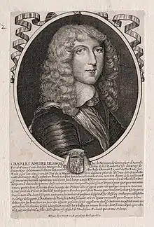 Charles Amadeus was killed by his brother-in-law, François de Bourbon, Duke of Beaufort in a duel in 1652.[4][5] He was buried at the Notre Dame d'Annecy in Annecy, the capital of the Genevois, of which the Dukes of Nemours were also counts. Charles Amadeus' brother Henri, who had been archbishop of Reims, withdrew from orders in order to succeed him in the title of Duke of Nemours.[2]