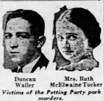 On January 27, 1923, Barr borrowed a car from a friend and drove to an isolated road near Memphis, which was known as a local lovers' lane. There, he came across 19-year-old salesman Duncan Waller from Mayfield, Kentucky and his mistress, Ruth McElwaine Tucker of Bowling Green.[3] He parked the car near them and approached them on foot, and upon reaching the automobile, he pulled out a .25 caliber pistol and shot Waller, killing him instantly. Frightened, Tucker leaped out of the car and sprinted towards a nearby field, but Barr caught up with her, raped her and then shot her as well.[4] After killing her, he stole the woman's jewelry and valuables before returning to the car and doing the same to Waller, and then fleeing the area. Their bodies were later discovered by a milkman doing his daily routine. Despite the police's and local citizen's detective agencies attempts to solve the case, nobody was arrested for the crime at the time.[4]