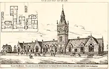 - Holme Hill School, Grimsby, Lincolnshire (1876). Corner of Heneage Road and Wellington Street.[6] The school was built for the Great Grimsby School Board to accommodate 1,165 children and cost £11,749. Over the entrance a central roundel bearing relief carving of the town seal with figures of Grim and Havelock the Dane, and above a stone band, inscribed “Great Grimsby Public Elementary Board School”. The School closed in 1967 and was extensively restored in 2014.[24]