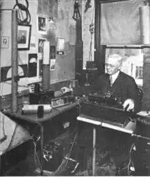 Apgar's equipment was mostly homemade with the exception of the headphones and of an improved Audion designed by Edwin Howard Armstrong that was part of the circuit used to detect and amplify the signal.[20] It was connected to a Dictaphone which allowed him to record Morse code transmissions on wax cylinders made by Edison Manufacturing Company.[21] His first recording was made October 12, 1913, of the New York Herald station, which by this time was using the call sign WHB.[lower-alpha 2] By October 1914, he had recorded other transmissions including the United States Navy station NAA sending time signals.[14]