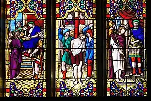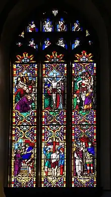 Stained glass by Clutterbuck, showing the trial an Crucifixion of Jesus, St Mary's Church, Bury St Edmunds
