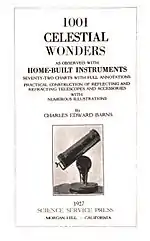 In 1927 Charles Barns, now in his mid-sixties, published 1001 Celestial Wonders as Observed Through Home-Built Instruments.[40] The book contained 72 color charts prepared by Barns himself, definitions of astronomical terms, photographs, and additional information.[41] In his dedication to grandson Charles Garbett, Barns described astronomy as a “thrilling adventure” for youth, an “engrossing problem” for adults, and “a joy always” in old age. He "wrote the text, prepared the charts, set the type, stereotyped the forms," and ran the press.[42] The combination of his thorough understanding, unbridled enthusiasm, and missionary zeal made for instant success among both professional and amateur astronomers. Charles Barns showed readers with clarity and precision how to build their own equipment, while simultaneously urging the pursuit of meaningful science.[42] The book was described as “unique in astronomical publications”[41] and a “splendid astronomical hand-book.”[39] The first edition sold out almost immediately, followed by the second edition in 1929.[41] Coinciding with the second edition was a Newspaper Enterprise Association (NEA) press release by San Francisco newspaperman Philip J. Sinnott. Appearing across the country was the subtitle “Ex-Newspaperman with Scientific Bent Studies Stars Through Homemade Telescopes.”[43] An “Oakland All-American Six” delegation from the Oakland Motors Division of General Motors arrived to tour the “Famous Farm" and to obtain a photograph of scientist Barns beside an Oakland model car.[44][45] On January 11, 1929, Charles Barns was elected a Fellow of the prestigious Royal Astronomical Society.[46]