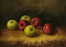 In 1878, Porter moved to Hartford, Connecticut and established a studio. The city was experiencing tremendous growth, and its wealthy citizens were interested in art and culture and had the money to begin or add to art collections. Porter's traditional academic art education made him a standout compared to the many self-taught artists who had recently moved to Hartford. He was one of the few artists at the time, and the only man, to specialize in still life painting.[1][4] While in Hartford, Porter created many of the still life paintings that he is known for today. A number of his paintings of fruit were not typical of the period, as they did not include tableware, porcelain, and glassware and unusual touches such as insects. His apple paintings were a commercial success and he painted apples for much of his career.[1]