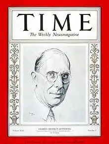 Charles Franklin Kettering (August 29, 1876 – November 25, 1958) sometimes known as Charles Fredrick Kettering[1] was an American inventor, engineer, businessman, and the holder of 186 patents.[2] He was a founder of Delco, and was head of research at General Motors from 1920 to 1947. Among his most widely used automotive developments were the electrical starting motor[3] and leaded gasoline.[4] In association with the DuPont Chemical Company, he was also responsible for the invention of Freon refrigerant for refrigeration and air conditioning systems. At DuPont he also was responsible for the development of Duco lacquers and enamels, the first practical colored paints for mass-produced automobiles. While working with the Dayton-Wright Company he developed the "Bug" aerial torpedo, considered the world's first aerial missile.[5] He led the advancement of practical, lightweight two-stroke diesel engines, revolutionizing the locomotive and heavy equipment industries. In 1927, he founded the Kettering Foundation, a non-partisan research foundation, and was featured on the cover of Time magazine in January 1933.