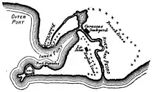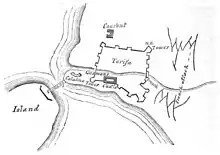 Smith's health suffered a good deal at Cadiz, and he was sent to Tarifa, near Gibraltar, to be Commanding Royal Engineer during the siege of Tarifa by the 8000 strong French force under General Laval. Colonel John Skerrett commanded the garrison of drafts from regiments at Gibraltar, with Spanish details, of 2,300 in total. The outposts were driven in on 19 December, and in ten days the French batteries opened fire. During this time Smith was busy making such preparations as he could for the defence of a very weak place. When, however, a gaping breach was made by the French after a few hours' firing, Skerrett called a council of war, proposed to abandon the defence, to embark the garrison on board the transports lying in the roadstead, and to sail for Gibraltar. Smith vehemently opposed the proposal, and prepared to make the most desperate resistance. Intimation of the state of affairs was sent to the Governor of Gibraltar, who promptly removed the transports and so compelled Skerrett to hold out. He also arranged to send assistance from Gibraltar. On 31 December 1811 the French made an unsuccessful assault. Bad weather and a continuous downpour of rain greatly damaged the French batteries and trenches, and supply became difficult owing to the state of the roads. On the night of 4 January 1812 it became known to the garrison that the French were preparing to raise the siege, and on the morning of the 5th the allies assumed the offensive, drove the French from their batteries and trenches, and compelled them to make a hurried retreat, leaving everything in the hands of the garrison. By general consent the chief merit of the defence has been given to Smith.[2] Napier, in his History of the War in the Peninsula, points out that though Skerrett eventually yielded to Smith's energy, he did it with reluctance, and constantly during the siege impeded the works by calling off the labourers to prepare posts of retreat.[2] "To the British engineer," Napier writes, "belongs the praise of this splendid action".[3]