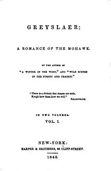 Hoffman's first book was A Winter in the Far West (1835), recounting his travels as far west as St. Louis, Missouri.[3] It was followed by Wild Scenes in Forest and Prairie (1839) based on actual experiences in search of health. He wrote a successful novel, Greyslaer (1840),[3] based on the murder of Colonel Solomon P. Sharp by Jereboam O. Beauchamp, known as the Beauchamp–Sharp Tragedy—an event that several writers, including Thomas Holley Chivers, Edgar Allan Poe and William Gilmore Simms, also fictionalized.[6] Hoffman's version, however, had little in common with the true event.[7]