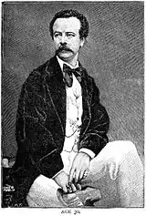 Worth began sewing dresses to complement the shawls at Gagelin. Initially, these were simple designs, but his expert tailoring caught the eye of the store's clients. Eventually, Gagelin granted Worth permission to open a dress department, his first official entrance into the dressmaking world.[8][9][10] A 1958 article in The Times published shortly before a centenary exhibition in London to mark the opening of his Paris fashion house noted that the ambitious Englishman's ideas were almost too much for his employers: "The young Worth, full of ideas, was having such a success at Gagelin's that it was felt necessary to restrain his rashness".[9] His obituary, written by a Paris correspondent for The Times explained this comment in somewhat more detail, saying that he was refused a share in the Gagelin business, even though he had extended its activities into making up, rather than just selling, garments.[11] He had also helped build the company's international reputation by exhibiting prize-winning designs to both The Great Exhibition of 1851 in London and the Exposition Universelle in Paris four years later.[6] At the Paris exposition he had displayed a white silk court train embroidered in gold.[1]