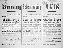 NOTICE. The English captain of a merchant ship, Charles Fryatt, of Southampton, though he did not belong to the armed forces of the enemy, attempted on March 28th, 1915, to destroy a German submarine by running it down. For this he has been condemned to death by judgment this day of the Field Court Martial of the Naval Corps, and has been executed. A ruthless deed has thus been avenged, belatedly but just. Signed VON SCHRÖDER, Admiral Commandant of the Naval Corps, Bruges, July 27th, 1916.